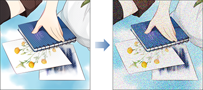 従来の色調補正の機能を強化しました。今までは彩度が上げられなかった薄い色や暗い色を鮮やかにしたり、明度や彩度の帯域ごとに上げ下げの調整をしたりすることが可能になっています。このプラグインは有償(500 GOLD)です。「ノイズを加える」(開発者:tempuraさん)