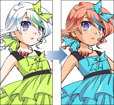 カラーのラスターレイヤーに描画されている画像の色を、ユーザーの設定した特定の色に置換します。キャラクターの色変更や、影またはハイライト色への置換に使う事を想定しています。変換対象のレイヤーの上端2ピクセルを色指定領域とし、フィルター実行前に置換する色を設定しておきます。1 ピクセル目を「元の色」、その直下の2 ピクセル目を「塗り替える色」として指定します。