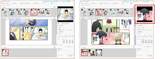 マンガのページ原稿を読み込み、マウスでドラッグするだけで簡単に1コマの範囲「コマ領域」を設定し、画像を携帯電話で表示するコマごとに分割できます。「コマ領域」の枠をクリックしてポイントを追加すると、枠線が斜めのコマなど複雑な形のコマ領域も作成できます。
