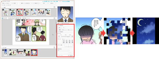 コマのサイズにあわせて自動で見せ方を設定したり、表示サイズやスクロールの方向・速度、バイブレーションの秒数などの演出を細かく設定したりできます。画面が切り替わる際の画面転換効果は、「ブラインド」、「ワイプ」、「チェッカーボード」など80種類を超える効果から選択できます。