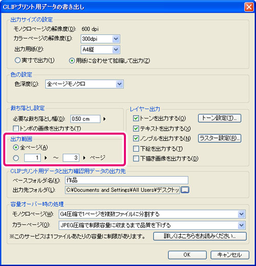 ComicStudioから、作品データのサイズに合わせてプリント出力する設定をしたあとに、プリントサービス用のファイル(拡張子:CWP)を出力する方法です。ComicStudioの[作品]ファイル全体をまとめて出力設定できます。