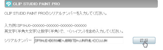 ・ダウンロードページの[限定特典 追加素材のダウンロード]をクリックすると、シリアルナンバーが入力された状態で認証ページが開きますので、そのまま[認証]をクリックします。