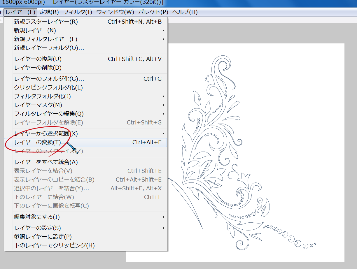 【3-1】「レイヤ」から「レイヤの変換」をクリックします。