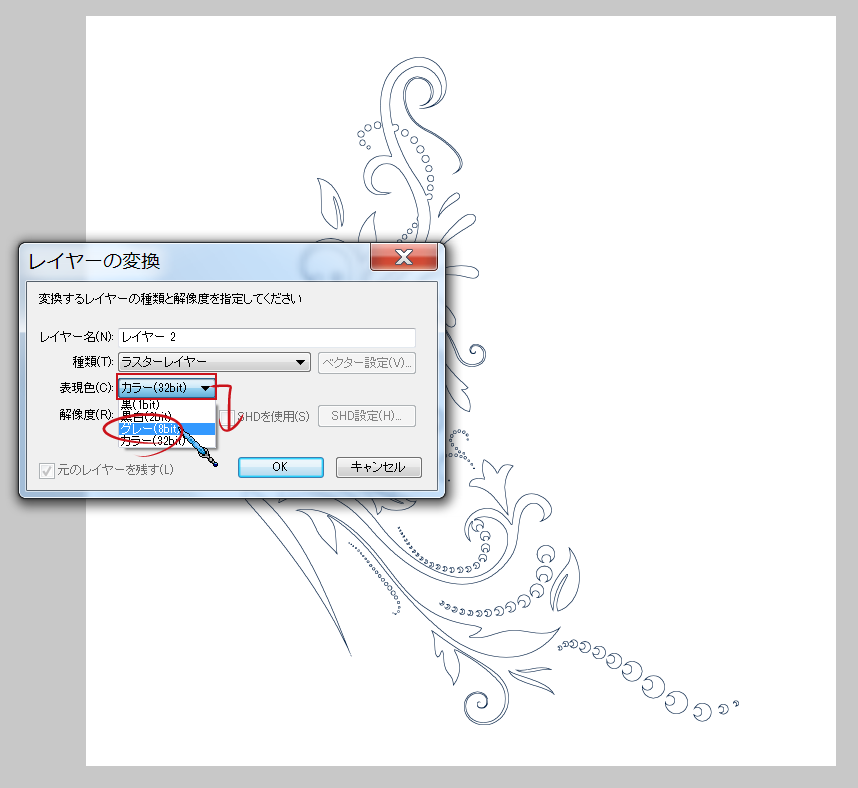 【3-2】「レイヤの変換」ダイアログが表示されますので、「表現色」を「グレー(8bit)」に変更して「OK」します。