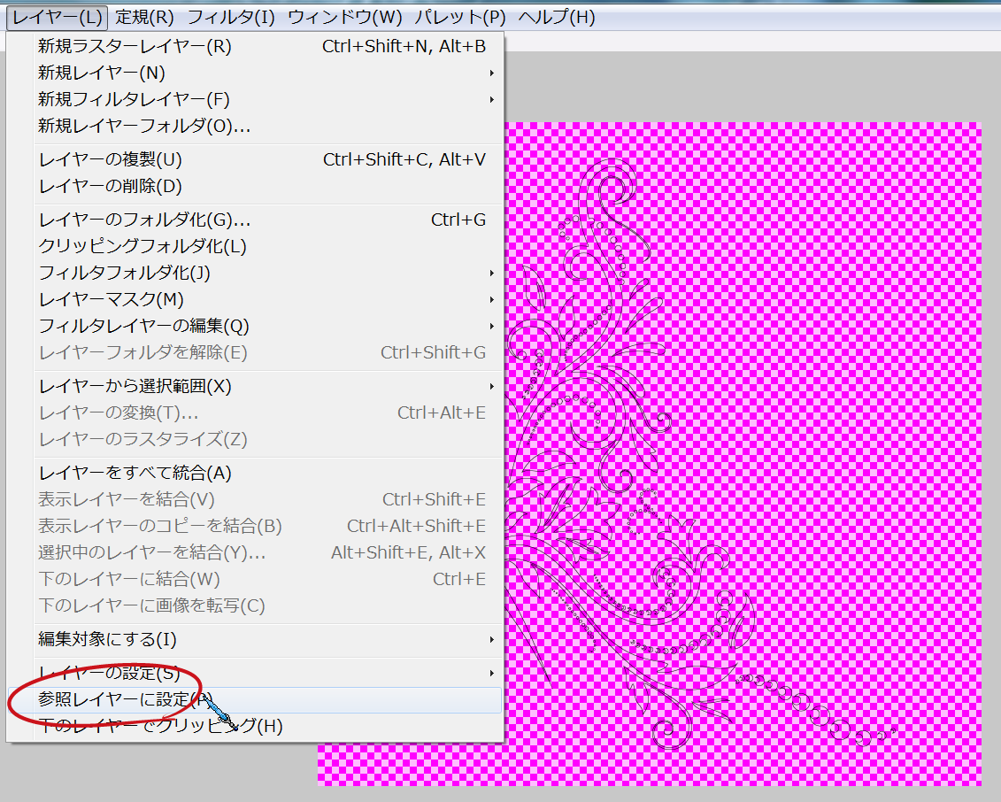 4.「レイヤ」→「参照レイヤに設定」を選択して線画レイヤを参照レイヤに設定します。