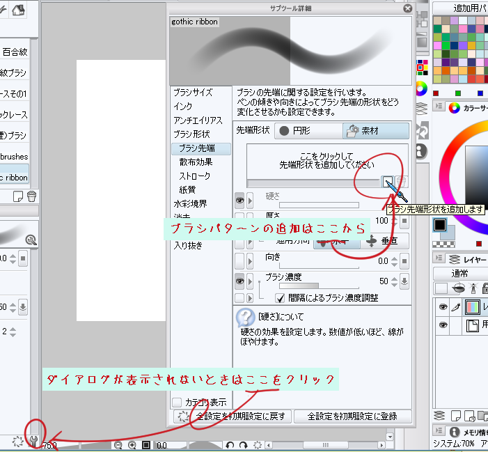 以下の説明の画像はすべてウィンドウズ版のものですが、Mac版であってもブラシ登録の手順自体は同じかと。