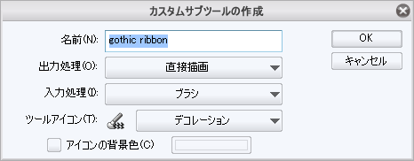5.「カスタムサブツールの作成」ダイアログが表示されますから、ブラシ名などを適当に設定して「OK」を押します。