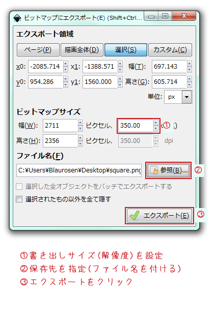 こうして作成した四角形は「ファイル」→「ビットマップにエクスポート」で