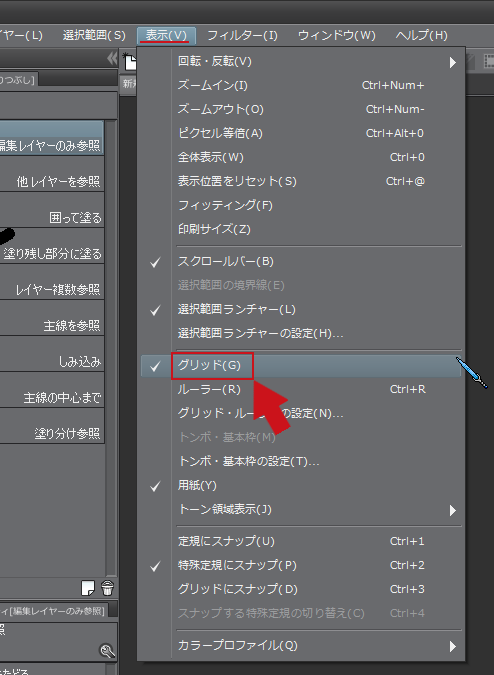 3.べた塗りできたら次に「表示」→「グリッド」でグリッドを表示して