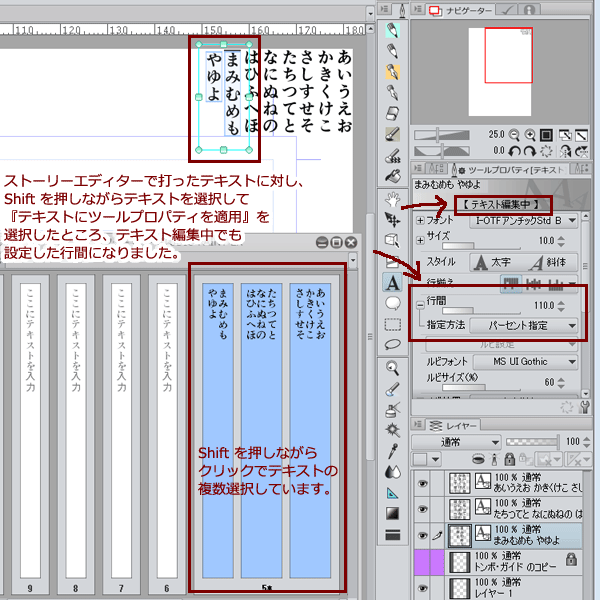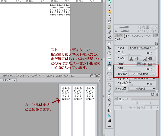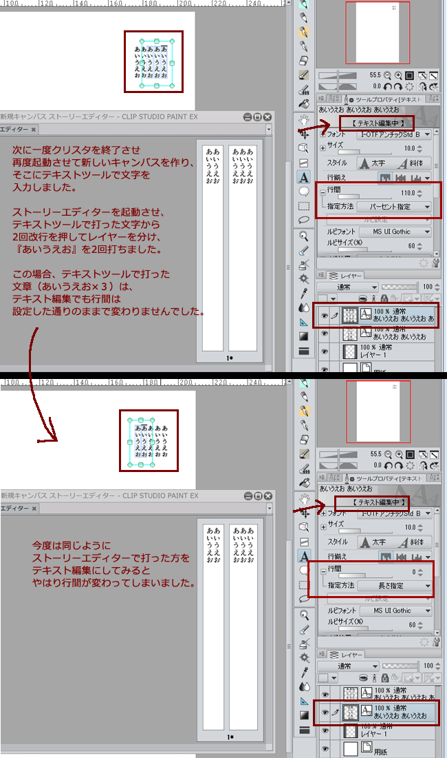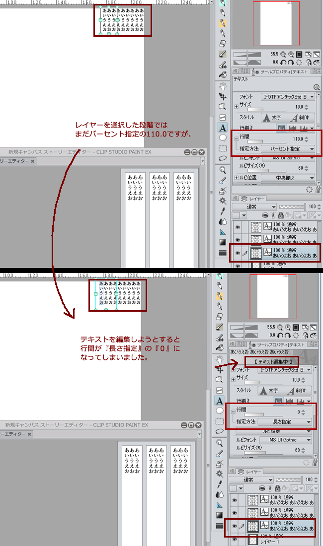 ※要望とどちらに投稿するか迷いましたが、もしかしたら設定の項目があるのかもしれないと思い、質問に投稿致しました。 CLIP STUDIO PAINT EXを使用しております。 この度ストーリーエディターが搭載され、ネーム作業で台詞をベタ打ちしている者としてはとても助かります。 が、ここに来てひとつ気になる事が出てきました。 ![]() 上記画像のように、テキストは行間を110%に設定し、それをサブツール詳細にて初期設定に登録してあります。 なので、ツールのテキストを使用した入力では常に行間が110%で表示されています。 ですが、ストーリーエディターで入力してページに反映させたテキストは、行間の設定が違っています。 (長さ指定の0=パーセント指定で100%の状態) ![]() 100%のままでも問題は無いと言えば無いのですが、個人的な読み易さでできれば110%で表示させたいのです。 ストーリーエディターから反映されるテキストの行間は、どこかで設定できるものなのでしょうか。 それとも設定項目はなく、行間を変える時は個別にテキストを指定して変更させるしかないのでしょうか。 もし設定出来るのであれば、どこで設定出来るのか教えて頂ければと思います。 よろしくお願いします。 ------------------------------------------------------------ ■バージョン:ver 1.3.5 ※[ヘルプ]メニュー → [バージョン情報]で確認できます。 ■グレード DEBUT( ) PRO( ) EX( ○ ) ■OS Windows XP( ) Windows Vista( ) Windows 7 ( ○ ) Windows 8( ) Windows 8.1( ) MacOS X 10.5( ) MacOS X 10.6( ) MacOS X 10.7( ) MacOS X 10.8( ) MacOS X 10.9( ) その他( ) ------------------------------------------------------------ |
