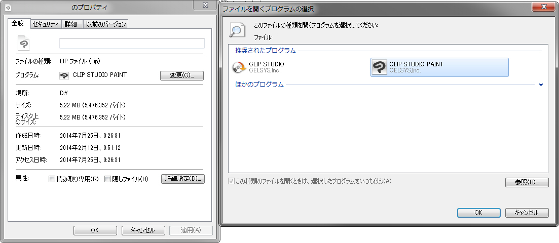 エクスプローラーやダイアログ内の.lipファイルのサムネイルが表示されなくなりました。 先日、PC内のデータを整理していた際に、lip形式のファイルが「不明なファイル」となっていた為、 [ファイルを右クリック] > [ プログラムから開く ] > [ 規定のプログラムの選択 ]の操作で「CLIPStudioPaint.exe」を選択しました。 その際、ファイルのアイコンが添付画像のようなアイコンに変わってしまい、サムネイルが表示されなくなりました。 この際どのような対応を行えば再度サムネイルが表示されるのでしょうか。 申し訳ございませんがご教示いただければ幸いです。 ![]() ------------------------------------------------------------ ■バージョン: ※[ヘルプ]メニュー → [バージョン情報]で確認できます。 ■グレード DEBUT( ) PRO( ○ ) EX( ) ■OS Windows XP( ) Windows Vista( ) Windows 7 ( ○ ) Windows 8( ) Windows 8.1( ) MacOS X 10.5( ) MacOS X 10.6( ) MacOS X 10.7( ) MacOS X 10.8( ) MacOS X 10.9( ) その他( ) ------------------------------------------------------------ |