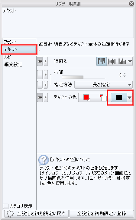 サブツール詳細の「テキスト」に文字色の設定があるはずですがありません。
