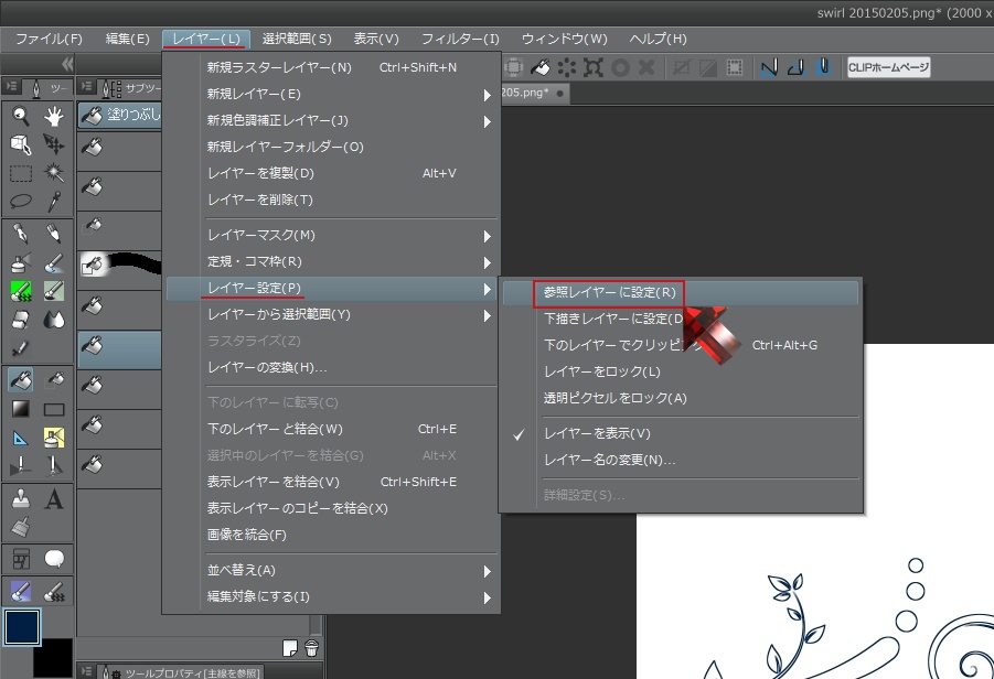 「レイヤ」→「レイヤ設定」→「参照レイヤに設定」をクリックして
