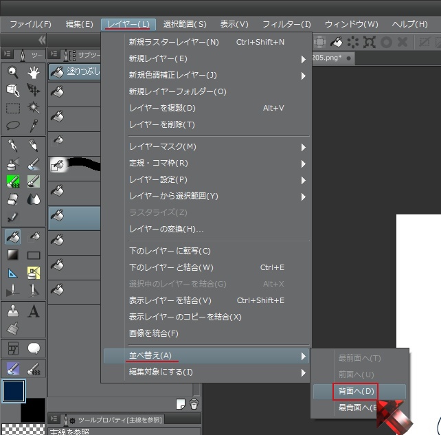 新規レイヤを作成したあと「レイヤ」→「並べ替え」→「背面へ」で