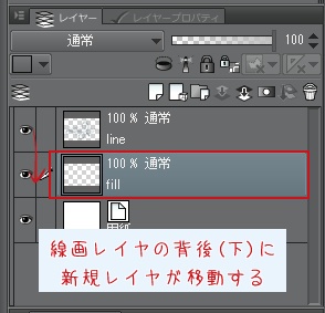 この新規レイヤを線画レイヤより下へ移動します。