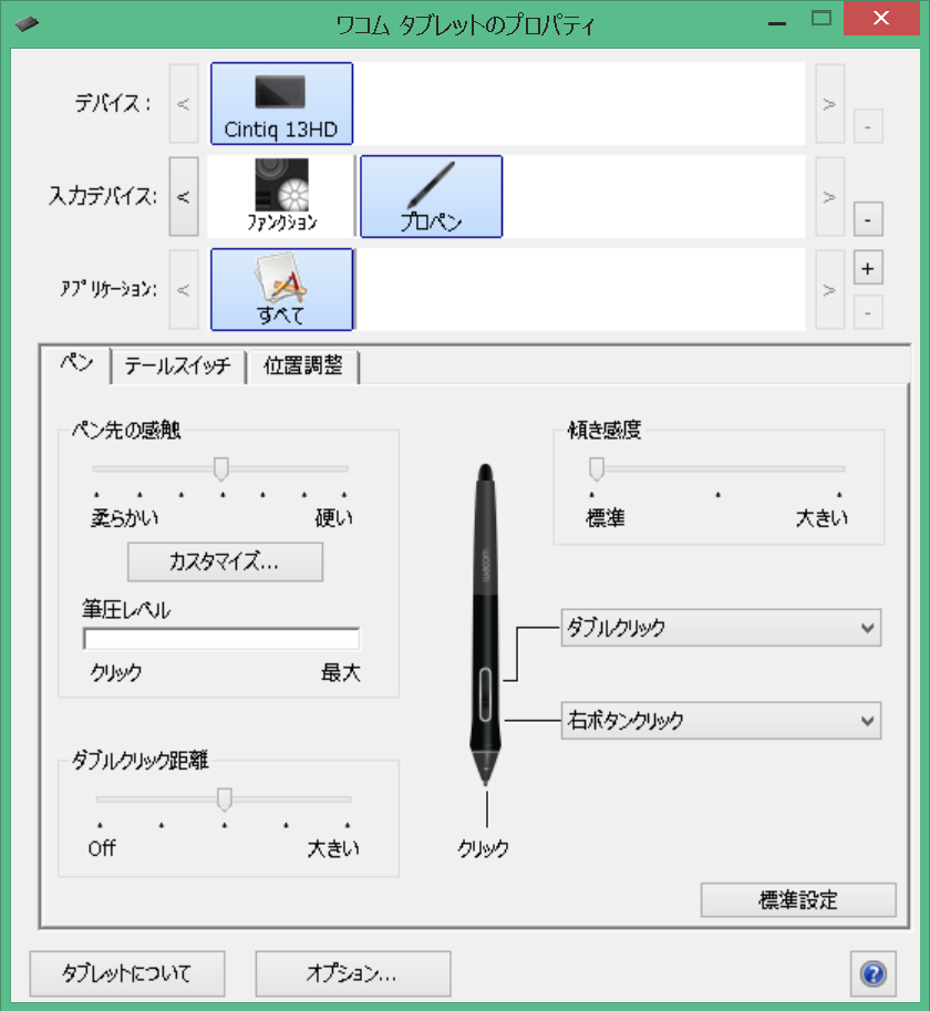 環境設定で 使用するタブレットサービスをTabletPCにすると位置は治るのですが 今度は筆圧が効かなくなります Wintabにしてそれより下の項目を全部変えて試しましたが効果ありませんでした