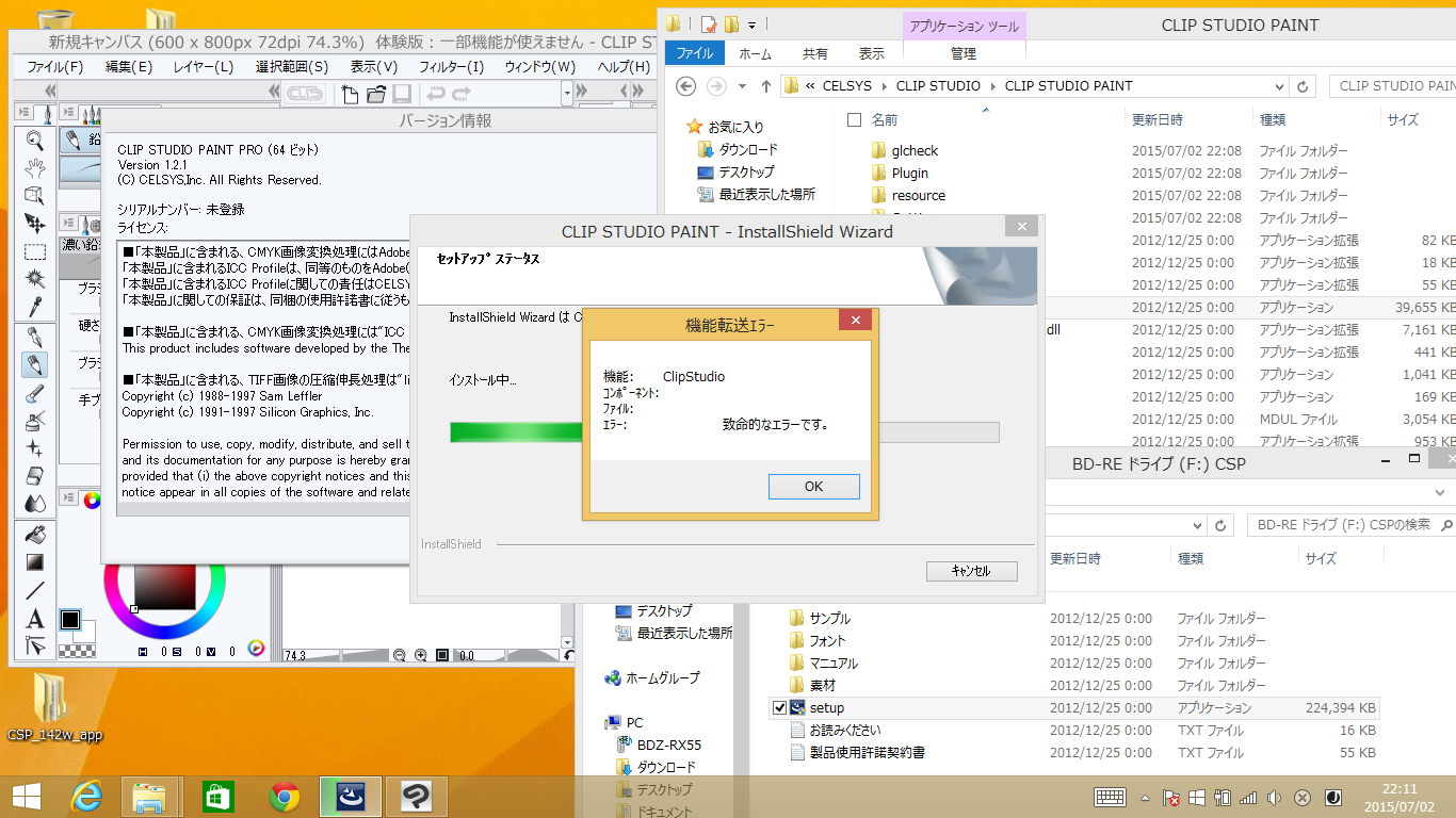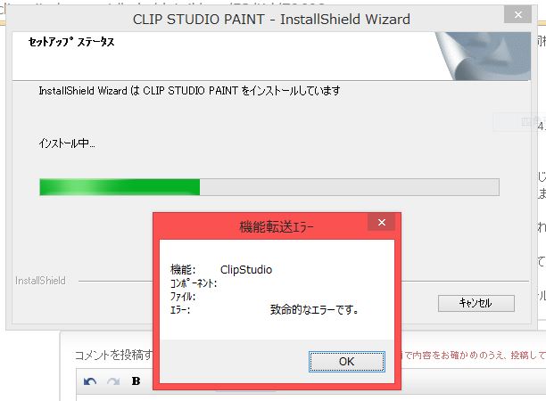 CLIP STUDIO PAINT Ver1.4.1のインストーラを走らせましたが、インストール先フォルダを指定(デフォルトのまま)し、利用規約に同意し、インストールを開始したところ、同様の箇所で「機能転送エラー」が発生しまし、インストールはできませんでした。