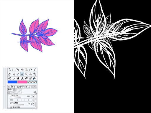 ![]() 3つのパレットがあって、青色が葉っぱの枠をとる主線となって、ピンクが全体を塗る色となっています。 この葉のサブツールを右端の市松模様のパレット(何という名称かわかりませんが、)で 色の塗られた、この画像では黒に塗られた場所にサブツールを使用すると、 図のように黒を削って葉の形ができます。 ですがこの画像だと葉の青色の部分だけが黒を削っています。 私は、この青とピンクで構成された葉の全体で黒を削りたいのです。 ですが、現状は図のように左端のパレット、青の部分だけが反映されてしまいます。 両方の色で黒を削るにはどうすればいいのでしょうか? ------------------------------------------------------------ ■バージョン: ※[ヘルプ]メニュー → [バージョン情報]で確認できます。 ■グレード DEBUT( ) comico( ) PRO( ) EX( ○ ) ■OS Windows XP( ) Windows Vista( ) Windows 7 ( ) Windows 8( ) Windows 8.1( ○ ) Windows 10( ) MacOS X 10.5( ) MacOS X 10.6( ) MacOS X 10.7( ) MacOS X 10.8( ) MacOS X 10.9( ) MacOS X 10.10( ) その他( ) ------------------------------------------------------------ |