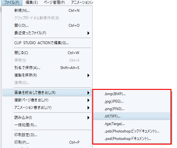 >1.[ファイル]メニュー→[画像を統合して書き出し]から印刷所から指定されたフォーマットを選択します。