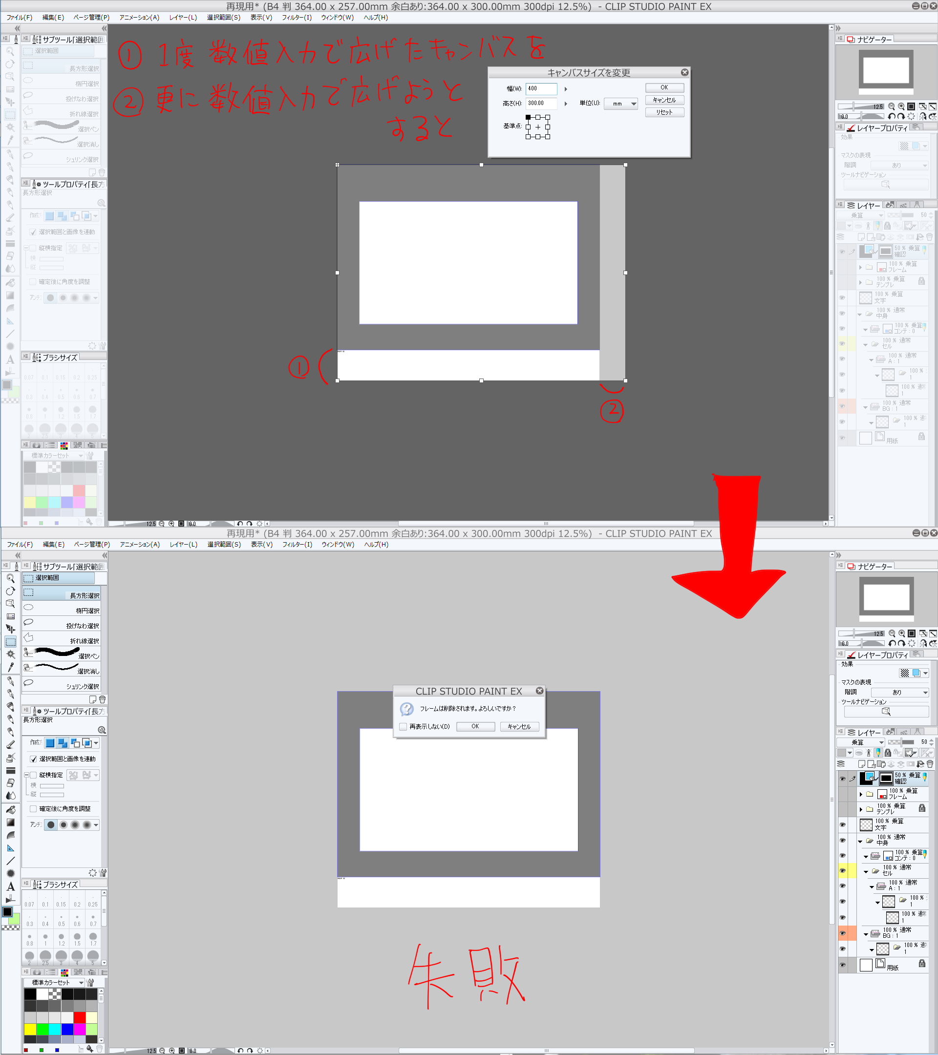 > にしようとすると、フレーム削除のパターンが大半ですが、フレームを維持したままキャンバスサイズの変更ができることもあります。