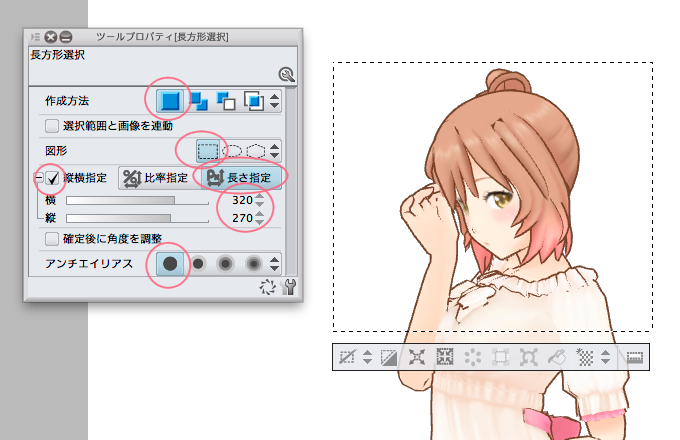 目視で選択すると、どうしてもイラストとキャンバスの端との間に余白部分ができたり、また、間違えてイラスト部分を削ってしまう可能性があるためです。。
