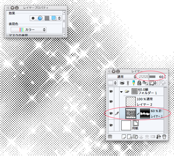レイヤーの不透明度でトーン濃度の調整もできます
