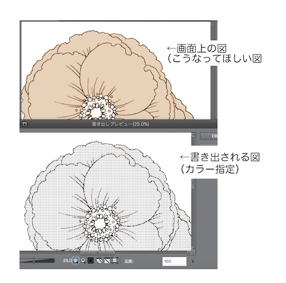 書き出しの時の表現色は「カラー」になってますでしょうか
