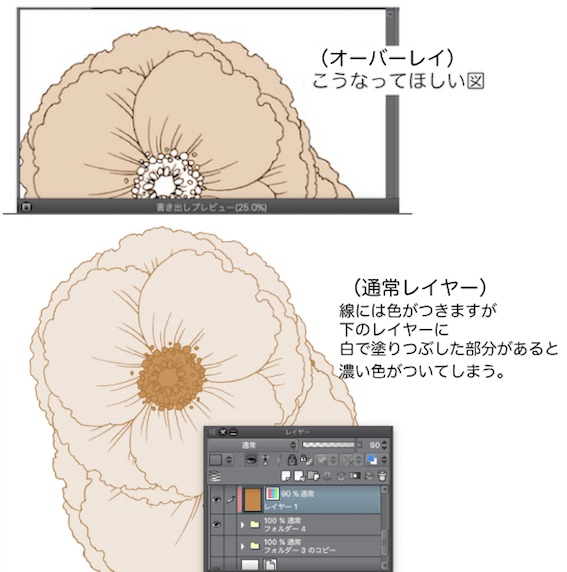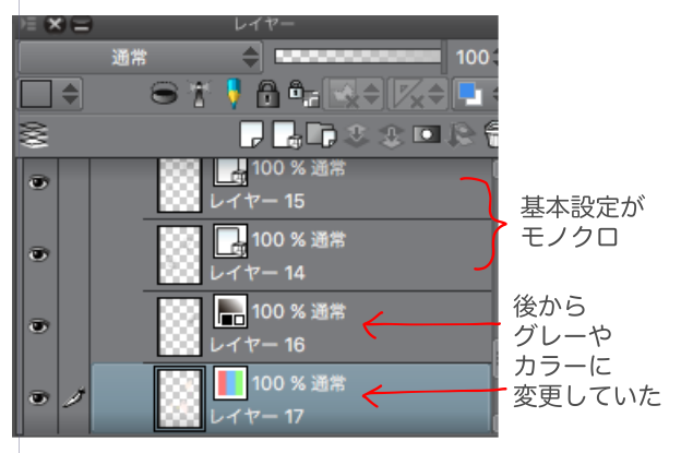 下のレイヤーが 黒の線画・トーンのものには色がつきませんでした。