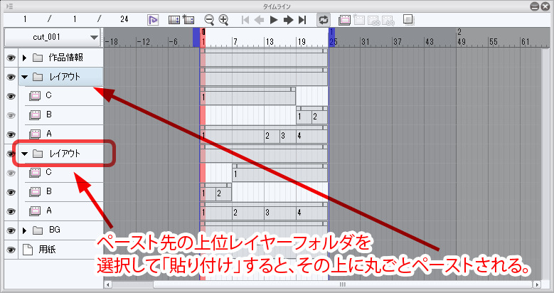 次にペースト先のキャンバスファイルも各セルは同様に上位レイヤーフォルダーに格納されている状態にしておき、