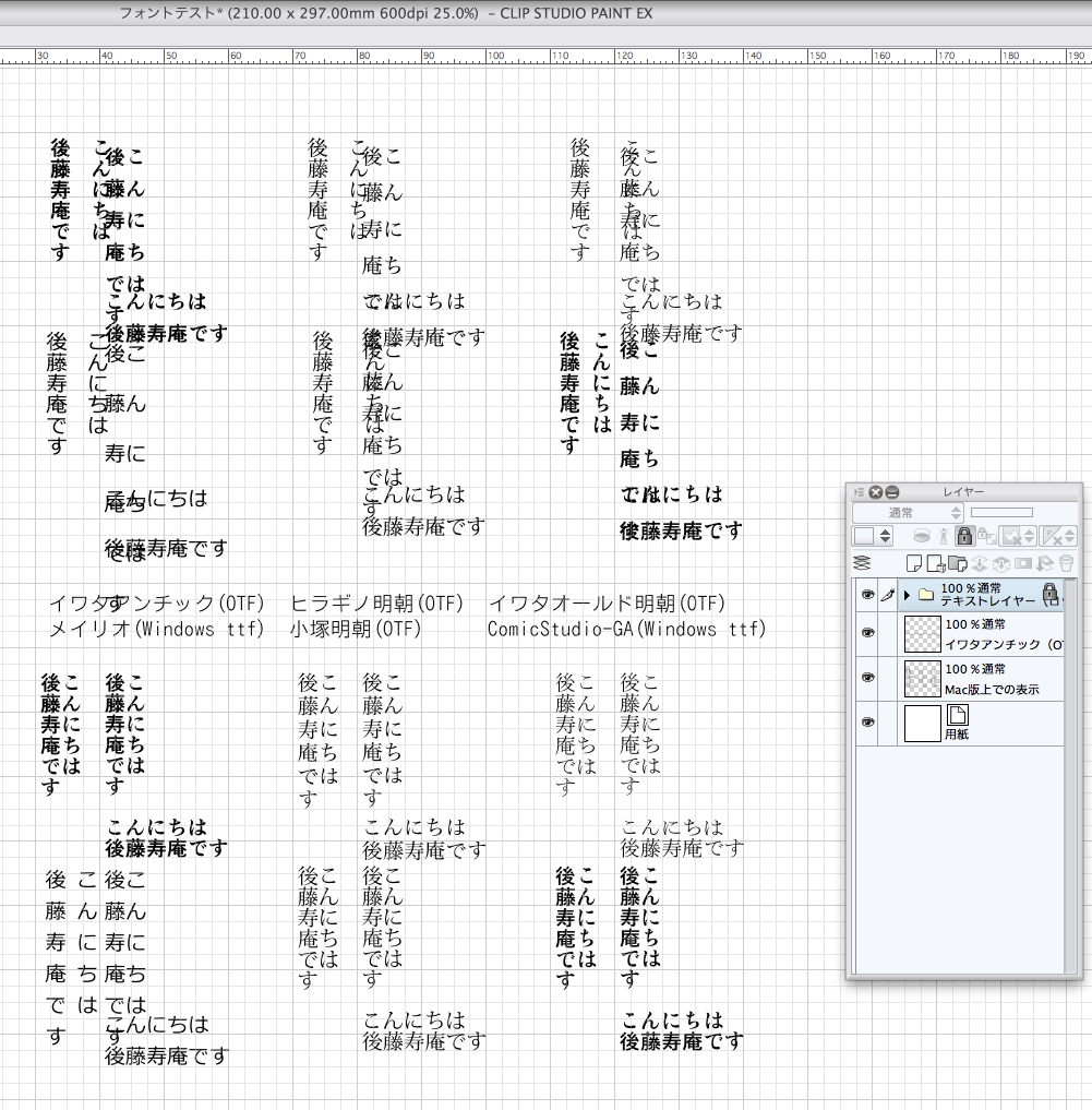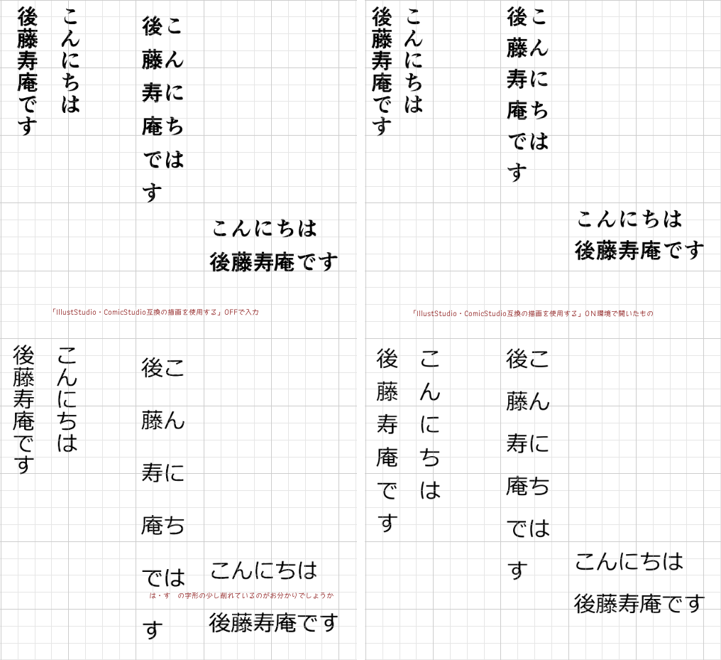 画像上段は「IllustStudio・ComicStudio互換の描画を使用する」オンの状態で作成・複製したテキストレイヤー(イワタアンチック体で入力、グリッドに沿って複製・整列後それぞれの書体に変更)、下段は後述症状比較用にMac版環境にてラスタライズしたものです。