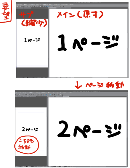 特に急ぎではないのですが、そのうち付いたらいいなーという要望です。 新規ウィンドウを開いて全体図を縮小表示させたものを置いて作業しています。 漫画の場合、メインウィンドウのページを切り替えても、サブウィンドウは元々のページを表示したままですが、 これをメインウィンドウと同じページを表示させるようにできると便利ではないかなと思います。 (メインのタブグループのクローンを表示してくれるような機能でもいいかもしれません) 説明が下手で申し訳ないのですが、ご検討いただけますと幸いです。 ![]() ![]() ------------------------------------------------------------ ■バージョン: ※[ヘルプ]メニュー → [バージョン情報]で確認できます。 ■グレード DEBUT( ) PRO( ) EX( ○ ) ■OS Windows XP( ) Windows Vista( ) Windows 7 ( ) Windows 8( ) MacOS X 10.5( ) MacOS X 10.6( ) MacOS X 10.7( ) MacOS X 10.8( ) その他( ) ------------------------------------------------------------ |