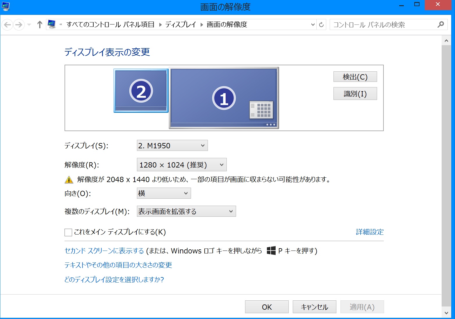 メニューにて[画面の解像度]を選択し、表示される画面のスクリーン