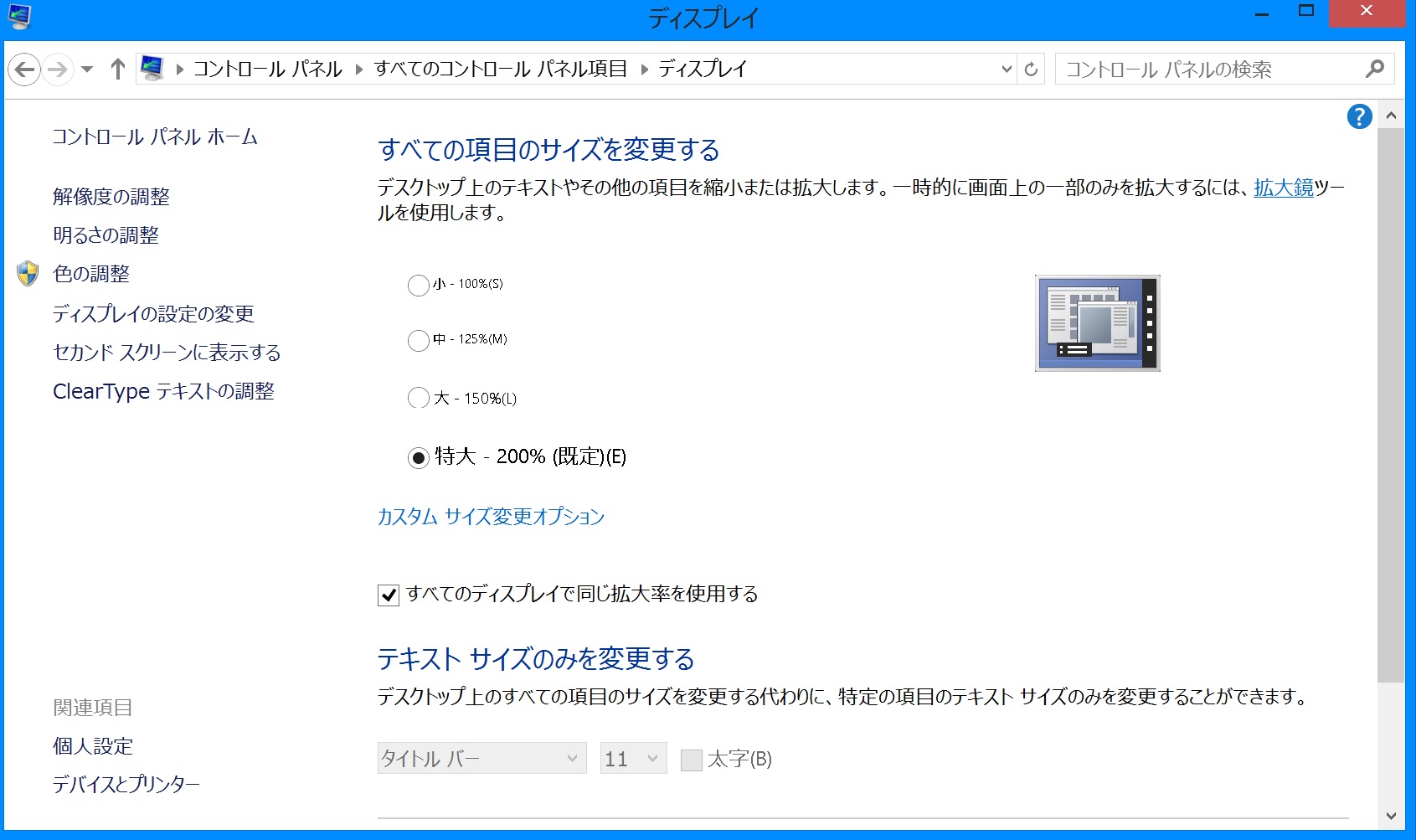 また、同画面の[テキストやその他の項目の大きさの変更]をクリックして