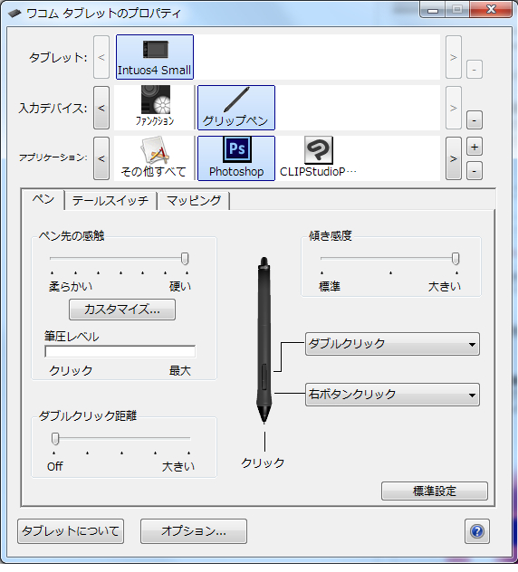 もし、フォトショップだけ割り当てているなら、同じ設定にクリスタもして貰うのも手だと思います。クリップスタジオは他に、クリップスタジオの筆圧の自動調整設定も存在します。