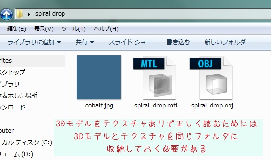 テクスチャであるjpegやpngのファイルがすべて同一フォルダ内に揃っている必要があります)