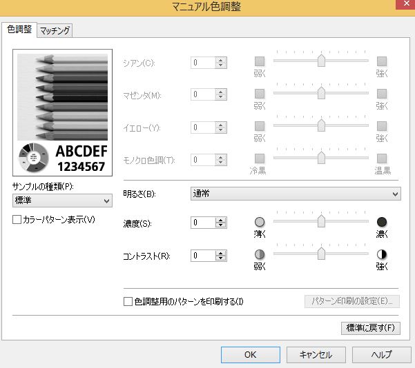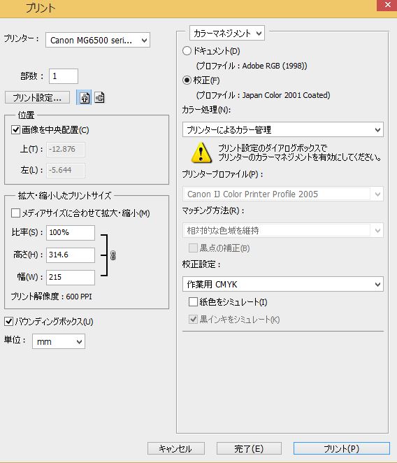 Canon PIXUS MG6530でトーンを印刷する時横線が入ってもうだめ。 結論。フォトショで綺麗に出ました。 考察。クリスタの印刷設定がかなり怪しい。一応これだろうと思って設定したのが災いした? (印刷設定を試す回数=バカ高いインクコストがかかるのでやってません) クリスタで適切な設定があるのであれば回答おねがいします。 一応試した手順を書いておきます。 プリンタの状態 今日買ったばかり。3時間前に届きました。 クリーニングもしました。正常です。 紙 普通紙使ってましたが、途中から漫画用原稿用紙にしました。 フォトショで成功を確認してるのは漫画用原稿用紙です。 フォトショで成功後、クリスタで印刷して失敗したのは漫画用原稿用紙です。 ・データはlip形式で保存しておく ・印刷設定を下記のようにしておく ![]() ・プリンタの設定は下記にしておく ![]() 基本設定の 色/濃度 はマニュアル設定にして、下記の値を入力する ![]() 印刷すると、横線が入る ・濃度を変えてもダメ ・BMPで出力するとにじんでダメ ・クリスタからlip形式をPSDで出力する ・PhotoshopCS5に持っていく ・出力する。 設定画面下記のようにする ![]() ・横線が入らず出力できた ・再びクリスタに戻り、先ほどフォトショップで印刷できたPSDデータを上記と同様の設定で出力する ・横線が入った。 lip形式のせいじゃないです。 PSD形式のせいじゃないです。 あやしいのはクリスタの印刷設定です。綺麗にでる設定があるなら教えてください。重ねてお願いします。 ------------------------------------------------------------ ■バージョン: ※[ヘルプ]メニュー → [バージョン情報]で確認できます。 ■グレード DEBUT( ) PRO( 体験版 ) EX( ) ■OS Windows XP( ) Windows Vista( ) Windows 7 ( ) Windows 8( ) Windows 8.1( 64bit ) MacOS X 10.5( ) MacOS X 10.6( ) MacOS X 10.7( ) MacOS X 10.8( ) MacOS X 10.9( ) その他( ) ------------------------------------------------------------ |