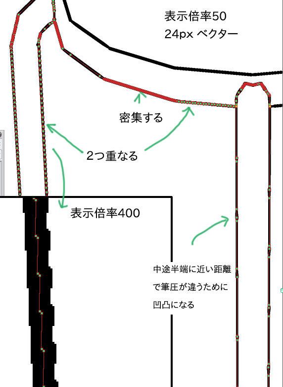 ブラシサイズが異なる(筆圧のかかり方が大きく異なる)場所ができます。