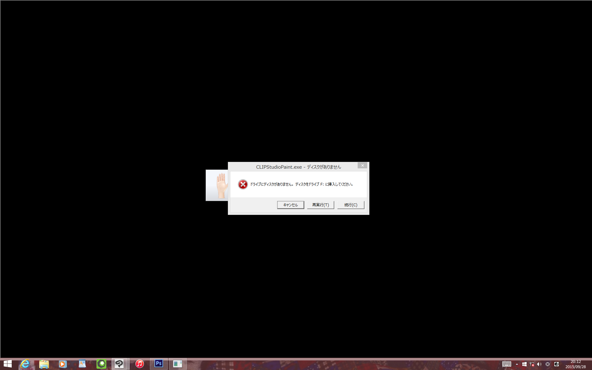 今までこんなことは1度も無かったのですが、とある3D素材をキャンバスにドラッグ&ドロップすると、「ドライブにディスクがありません。ディスクをドライブF:に挿入してください。」と出ます。 その素材は↓になります。 可動の両手 コンテンツID:1531786 他の素材でこのような現象が起きたことはありません。 キャンセルを選択するとフリーズしてタスクマネージャーからでないと終了しません。 PCを再起動しても変わりませんでした。 プリスクを取ろうと思ったのですが、なぜかペーストしても取れていなかったので写メを撮ってみました。 ![]() 対処法をよろしくお願いします。 ------------------------------------------------------------ ■バージョン:1.4.3 ※[ヘルプ]メニュー → [バージョン情報]で確認できます。 ■グレード DEBUT( ) comico( ) PRO( ) EX( ○ ) ■OS Windows XP( ) Windows Vista( ) Windows 7 ( ) Windows 8( ) Windows 8.1( ○ ) Windows 10( ) MacOS X 10.5( ) MacOS X 10.6( ) MacOS X 10.7( ) MacOS X 10.8( ) MacOS X 10.9( ) MacOS X 10.10( ) その他( ) ------------------------------------------------------------ |