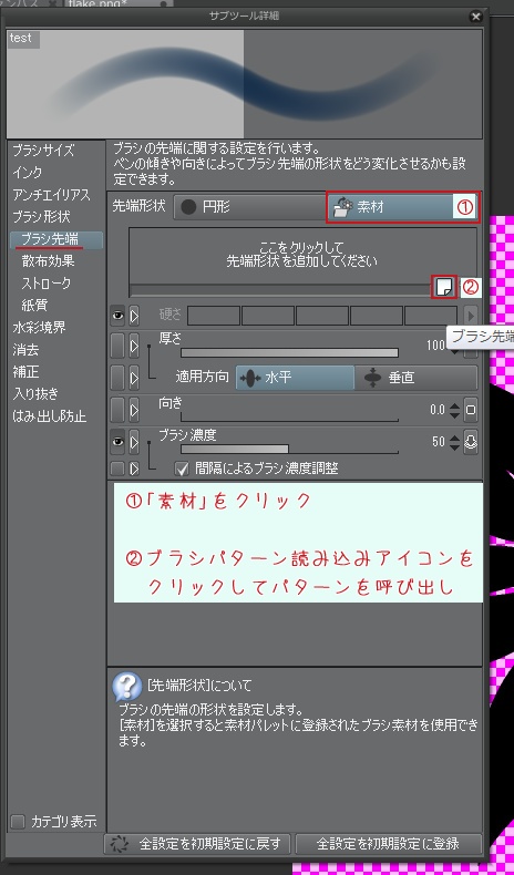 7.あとは「ブラシ先端」カテゴリから先端形状を「素材」に指定したあと