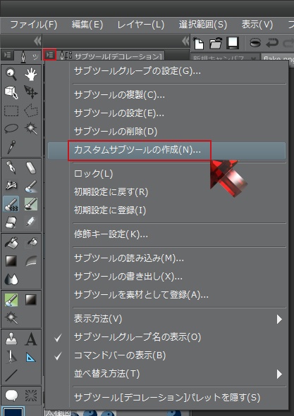 表示される一覧(メニュー)から「カスタムサブツールの作成」をクリックします。