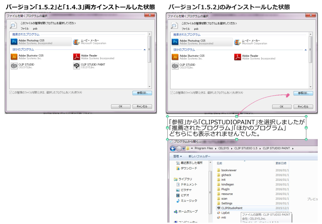 現在、CLIPSTUDIO EXのバージョン1.5.2を使用していますが、以前使用していた「バージョン1.4.3」のプログラムをPCの容量整理のためにアンインストールしたところ、JPGやPSDなどのデータを右クリックすると表示される「プログラムを開く」の一覧からCLIPSTUDIOだけが消えて選択できなくなってしまいました。 PCの再起動や1.5.2の再インストールも試みましたが症状は改善せず、「ファイルの種類またはプロトコルの関連づけ」>「プログラムの変更」を試しましたが、CLIPSTUDIOを選択することはできませんでした。(※1.5.2の「ファイルの関連付け設定」は「はい」を選択していました) ![]() 最終的に、消した「バージョン1.4.3」を再インストールしたところ、元通り「プログラムを開く」の一覧に元通り表示されるようになりましたので、現在はバージョン1.5.2と1.4.3を両方インストールして使用しています。 不具合はなおりましたが、今後も最新バージョンのCLIPSTUDIOと過去の「バージョン1.4.3」を両方インストールしておかなければ不具合が生じてしまうのか不明なため、お問い合わせをさせて頂きました。 どうぞよろしくお願い致します。 ------------------------------------------------------------ ■バージョン:1.5.2 ※[ヘルプ]メニュー → [バージョン情報]で確認できます。 ■グレード DEBUT( ) comico( ) PRO( ) EX(○) ■OS Windows XP( ) Windows Vista( ) Windows 7 (○ ) Windows 8( ) Windows 8.1( ) Windows 10( ) MacOS X 10.5( ) MacOS X 10.6( ) MacOS X 10.7( ) MacOS X 10.8( ) MacOS X 10.9( ) MacOS X 10.10( ) MacOS X 10.11( ) その他( ) ------------------------------------------------------------ |