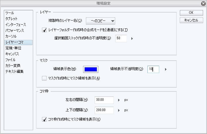 *[環境設定]にて[レイヤー・コマ]を選択した状態の画面