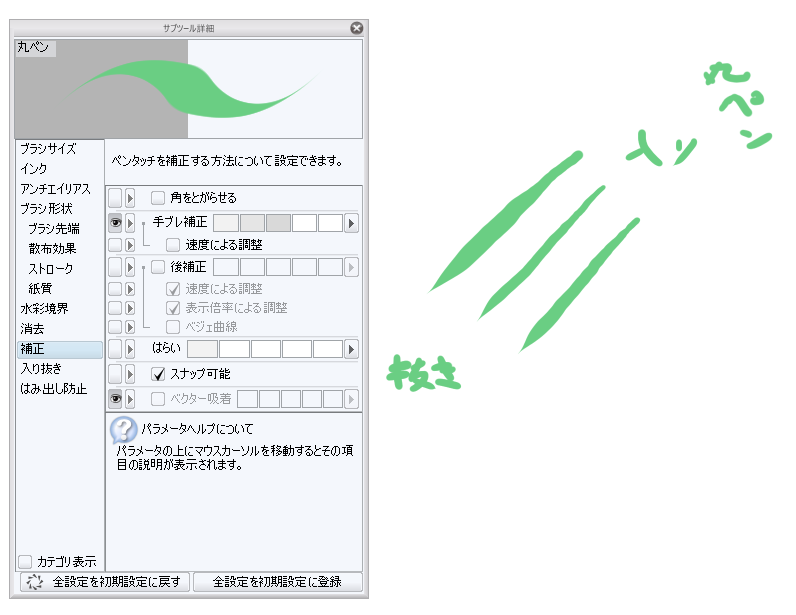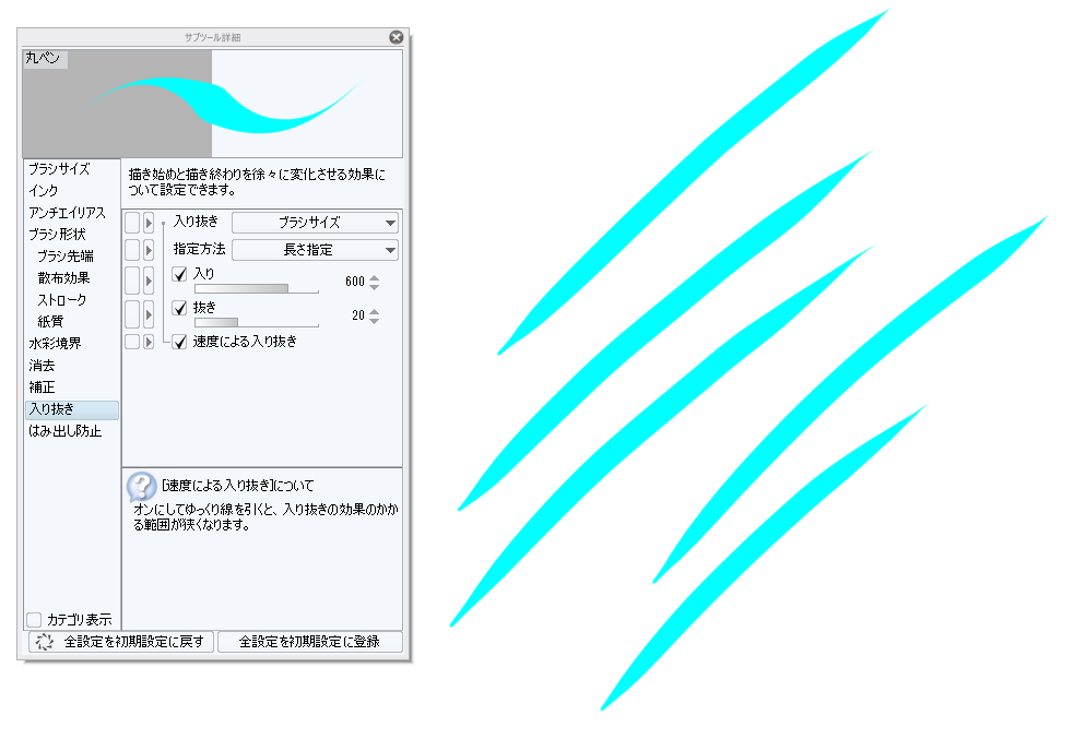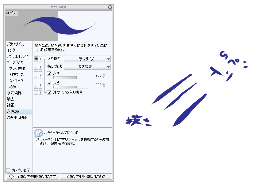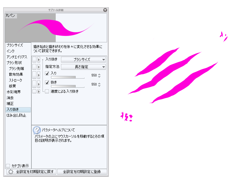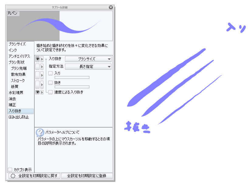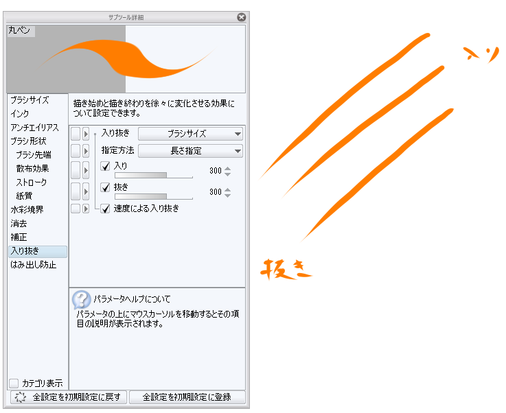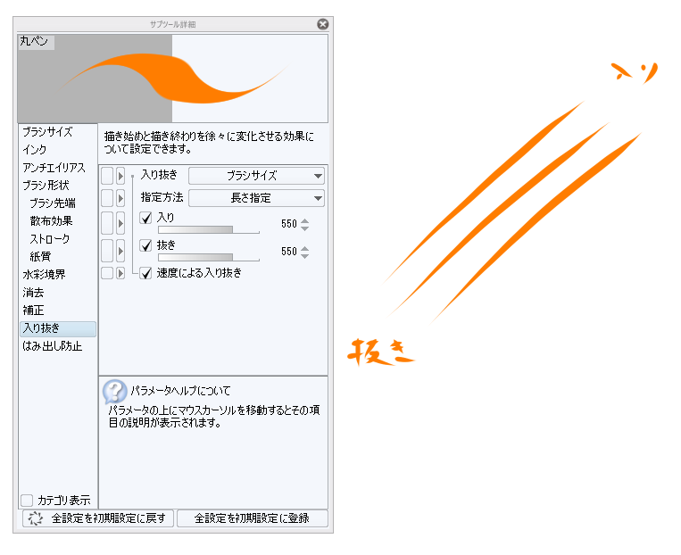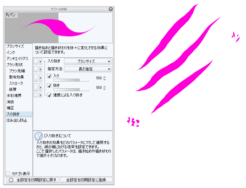 になっている場合、そちらをクリックし、「入り抜き影響先設定」にて[ブラシ