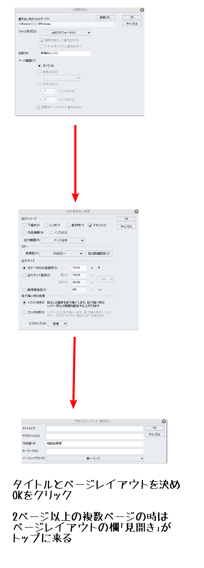 EXのPDFプラグインからPDFを書き出すとき現在は 書き出し先フォルダ選択ダイアログ⇒出力範囲や色深度、原稿サイズの設定ダイアログ⇒作品名(作品を単ページや見開きにするかの設定ダイアログと段階を踏んで出力しますが コミスタのエクスポートダイアログのように一つのダイアログですべてできるようにしてもらえないでしょうか? 現在の方式だとかなり面倒なので改善してほしいです ![]() ------------------------------------------------------------ ■バージョン:1.5.4 ※Windowsは、[ヘルプ]メニュー → [バージョン情報]で確認できます。 ※MacOSXは、[CLIP STUDIO PAINT]メニュー → [バージョン情報]で確認できます。 ■グレード DEBUT( ) comico( ) PRO( ) EX( ○ ) ■OS Windows XP( ) Windows Vista( ) Windows 7 ( ○ ) Windows 8( ) Windows 8.1( ) Windows 10( ) MacOS X 10.5( ) MacOS X 10.6( ) MacOS X 10.7( ) MacOS X 10.8( ) MacOS X 10.9( ) MacOS X 10.10( ) MacOS X 10.11( ) その他( ) ------------------------------------------------------------ |