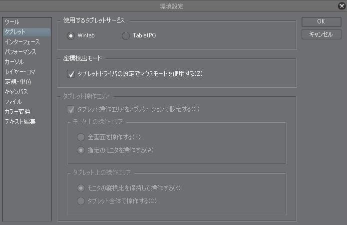 ・[ファイル]メニュー→[環境設定]を開き、[タブレット]を