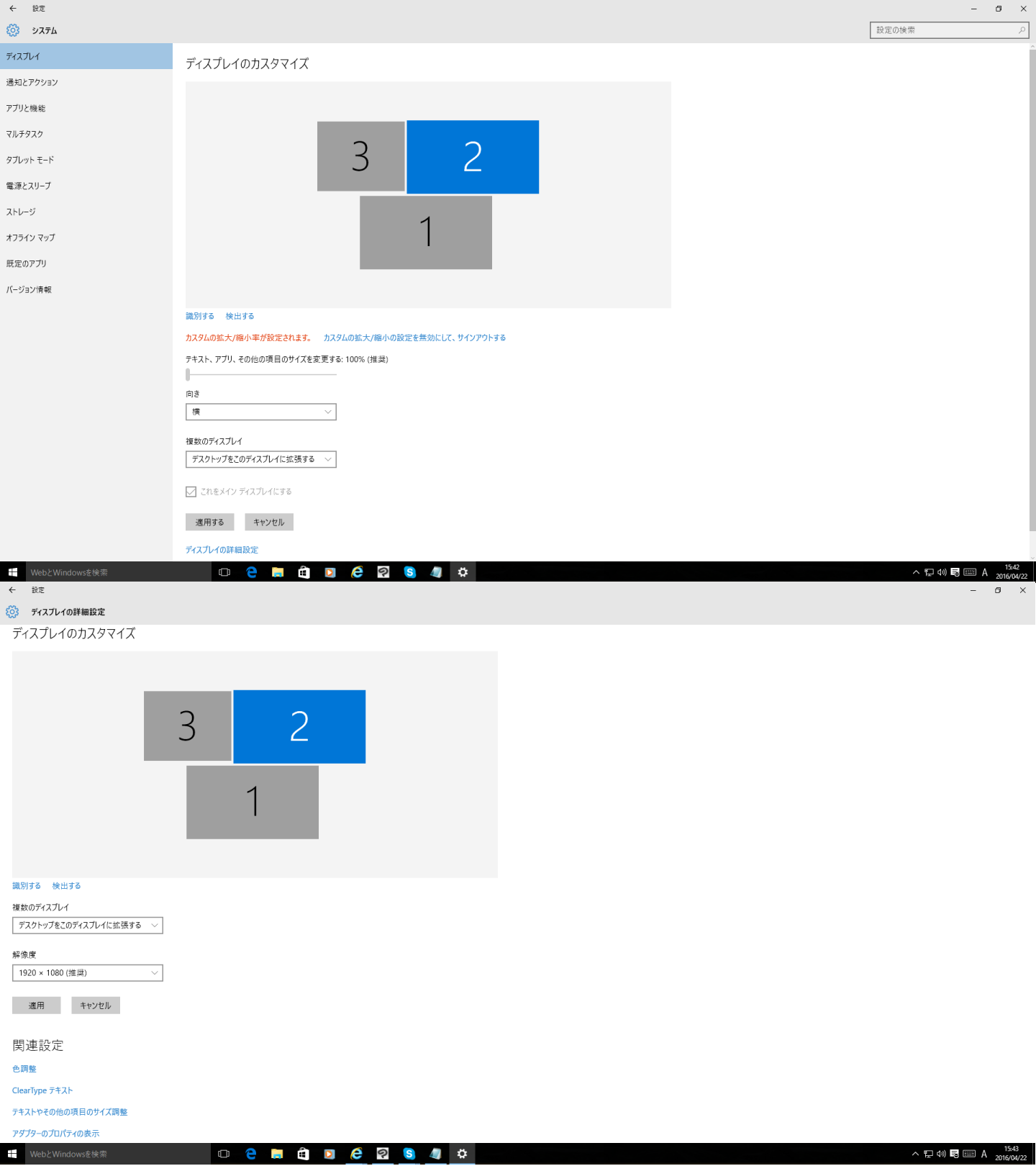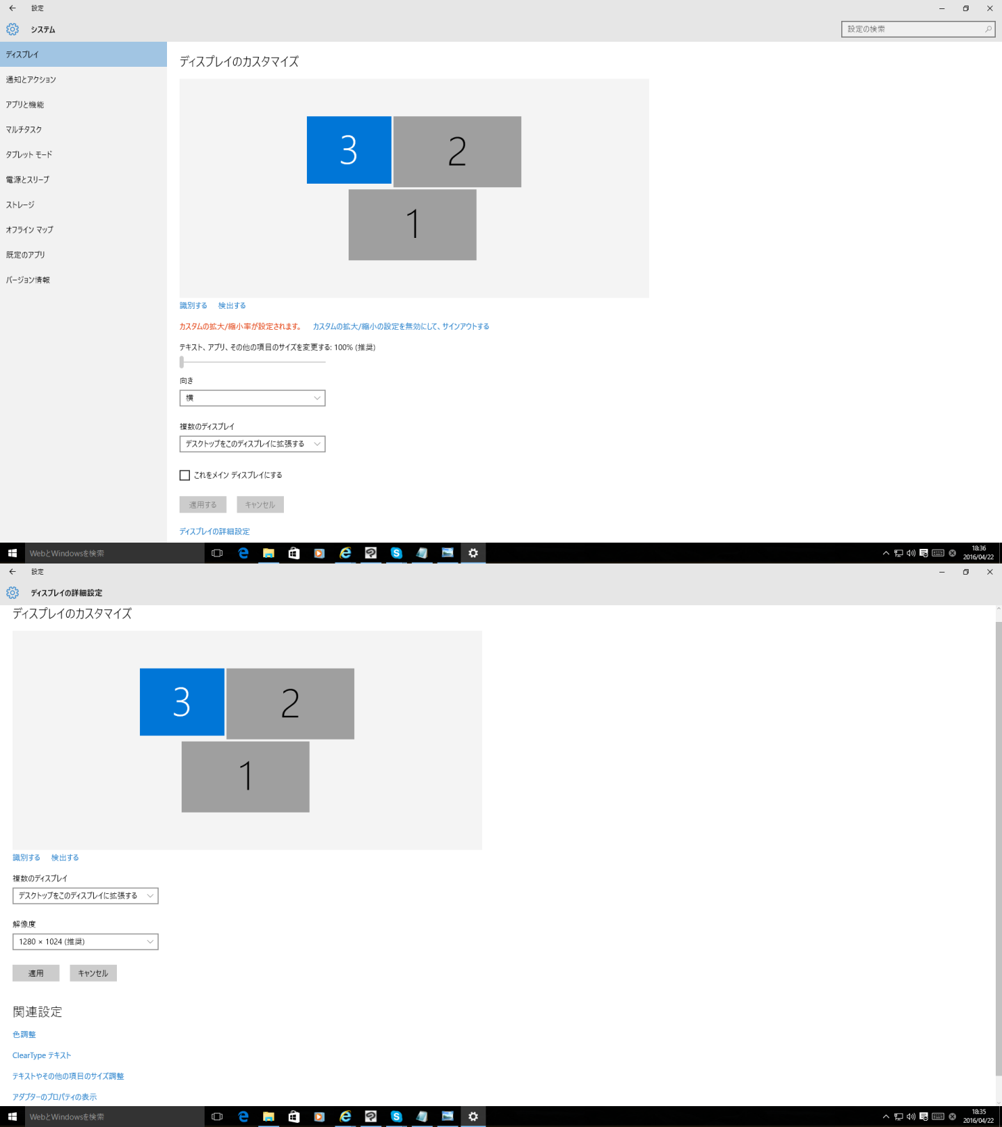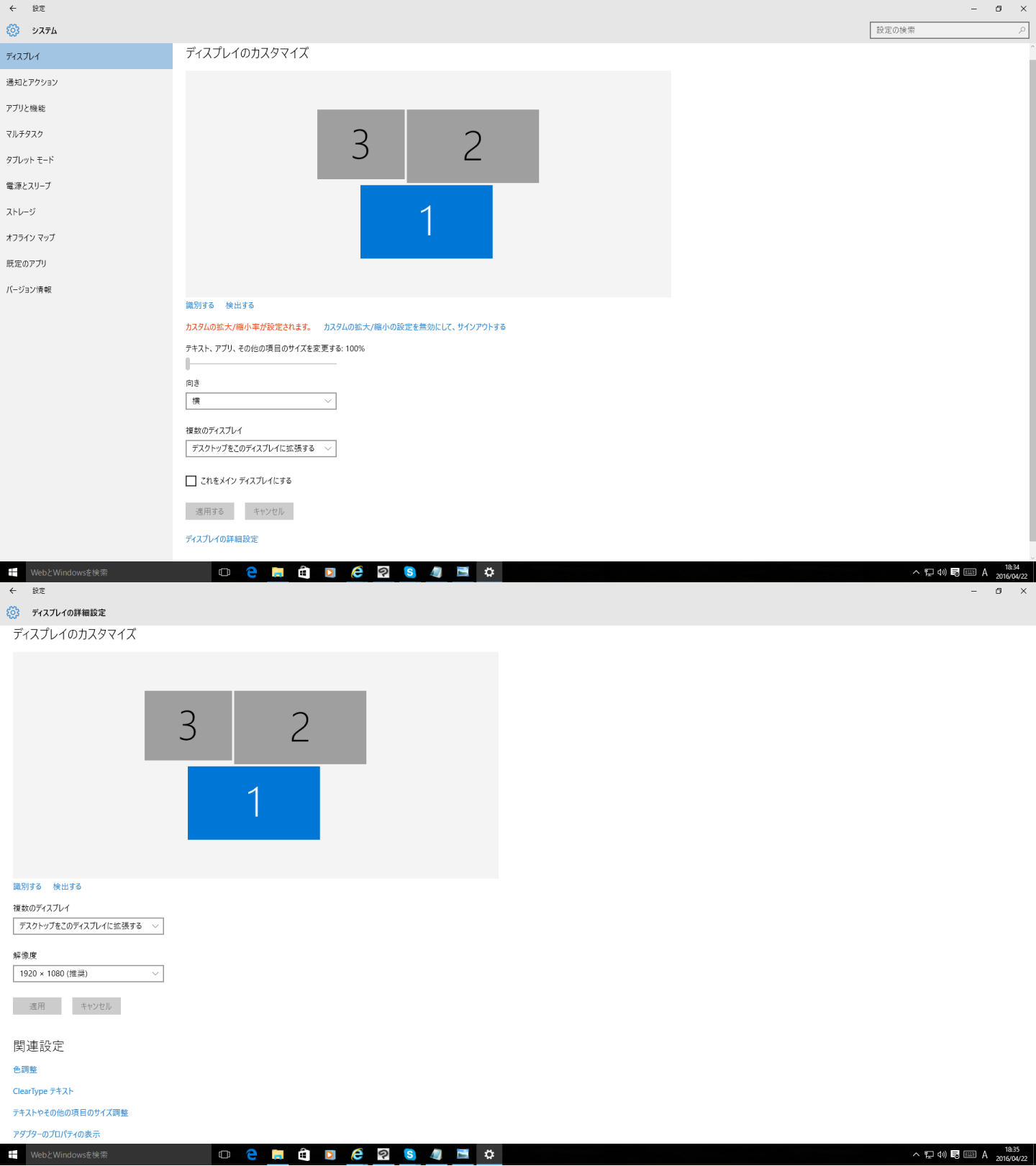 3.同ウィンドウ内にある[ディスプレイの詳細設定]をクリックし、[解像度]の設定が