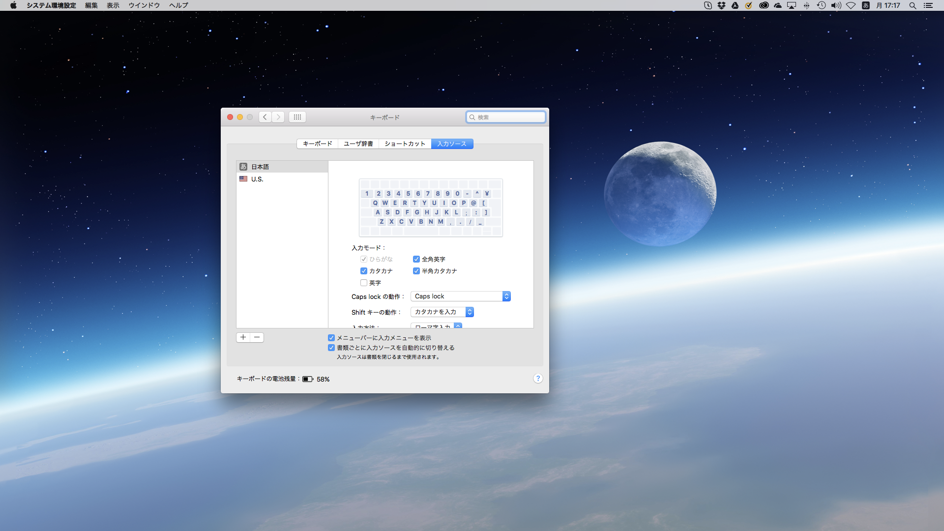 ・システム環境設定→キーボード→入力ソースを開いた状態のスクリーンショット。