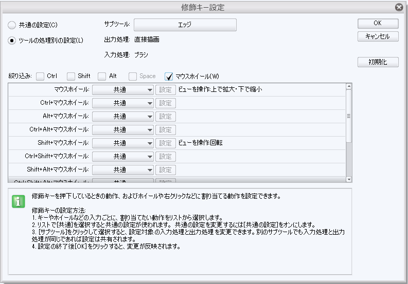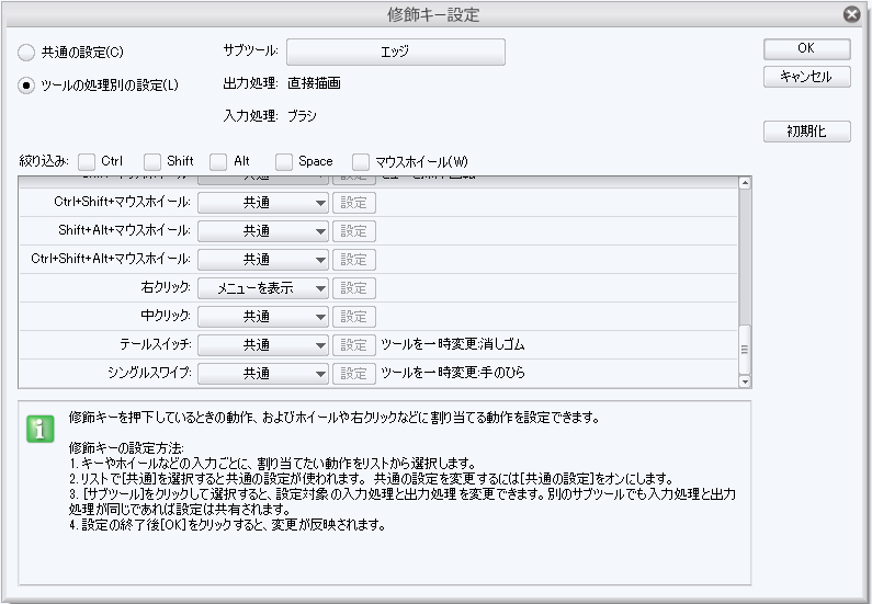 >[修飾キー設定]ダイアログにて[ツール処理別の設定]を選択し