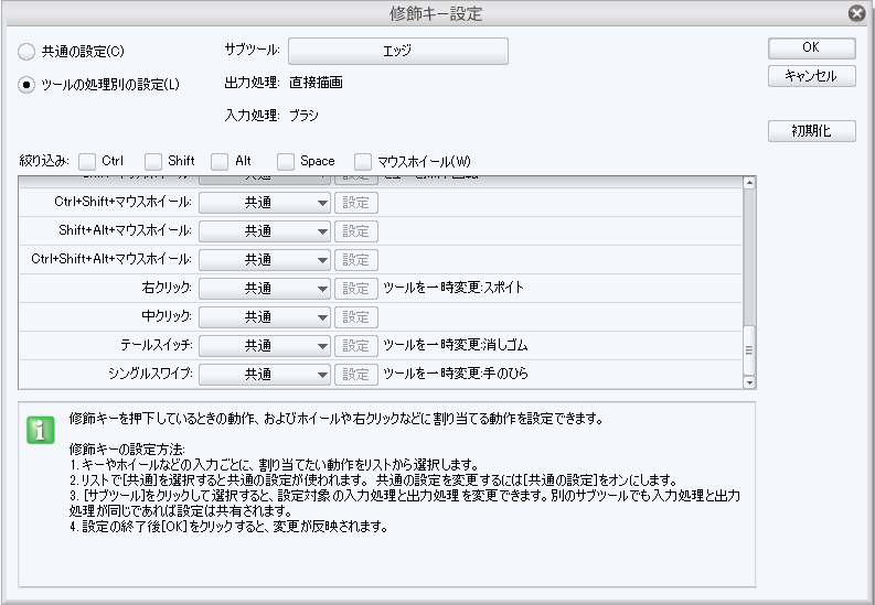 ・[修飾キー設定]ダイアログにて[ツール処理別の設定]を選択し