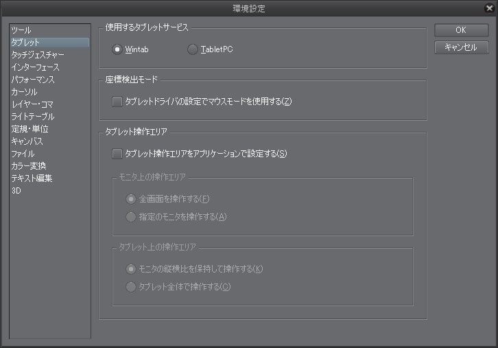 表示される画面左側で[タブレット]を選択した状態の画面のスクリーンショット